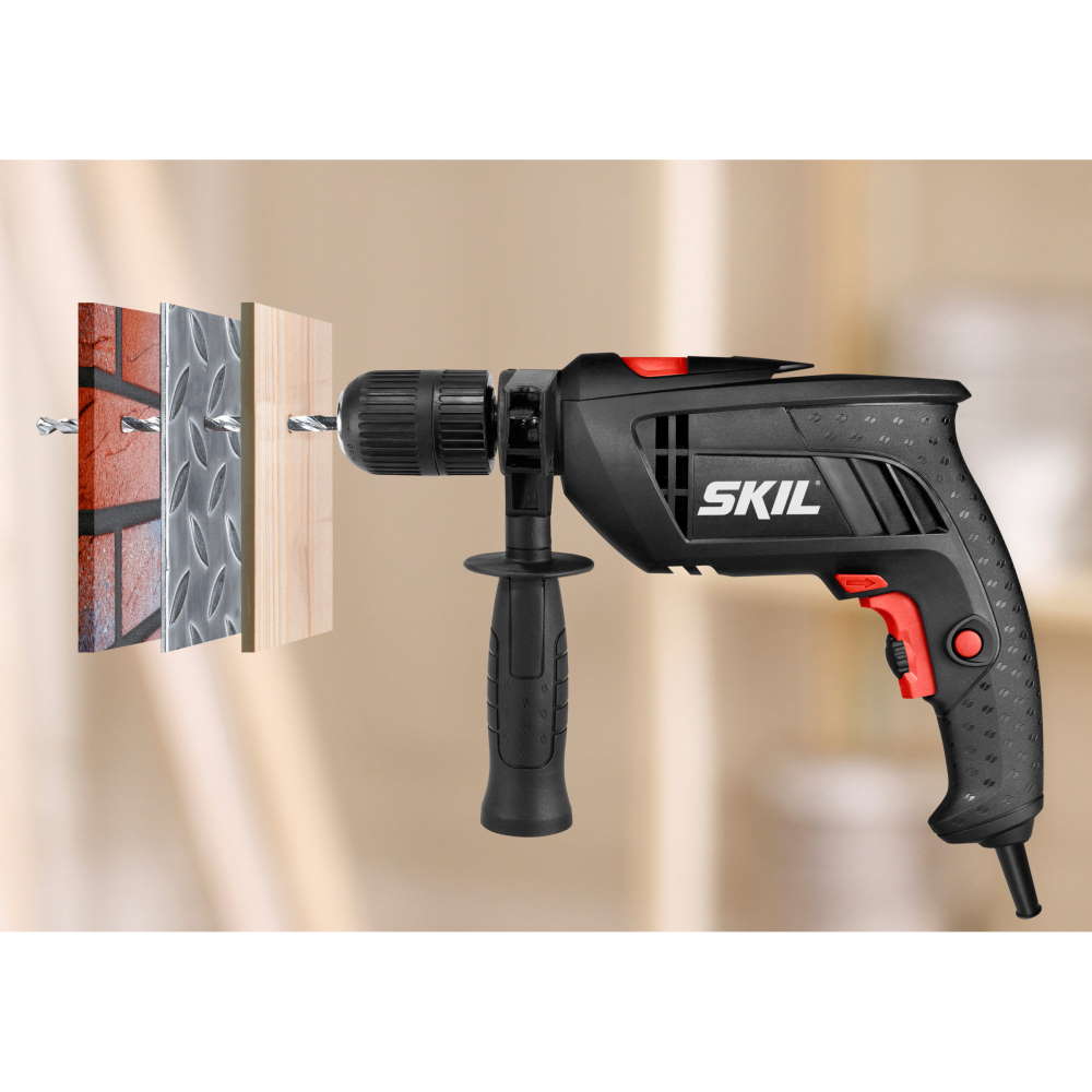 Mașina de găurit cu percuție SKIL 6290 este unealta ideală pentru toate lucrările de găurire din casă și în jurul casei. Echipată cu un motor puternic, de 710 W. Are o construcție compactă și o serie de funcții convenabile, de exemplu indicatorul modului. Acestă maşină de găurit cu percuţie este echipată cu o mandrină fără cheie, cu manşetă dublă, de 13 mm, care permite schimbarea rapidă şi simplă a accesoriilor. Turaţia variabilă cu viteză pre-selectabilă oferă caracterul multilateral şi controlul lucrărilor. Această maşină de găurit cu percuție se livrează împreună cu un mâner lateral, un sistem de reglare a adâncimii și trei burghie pentru zidărie, de 5, 6 și 8 mm.